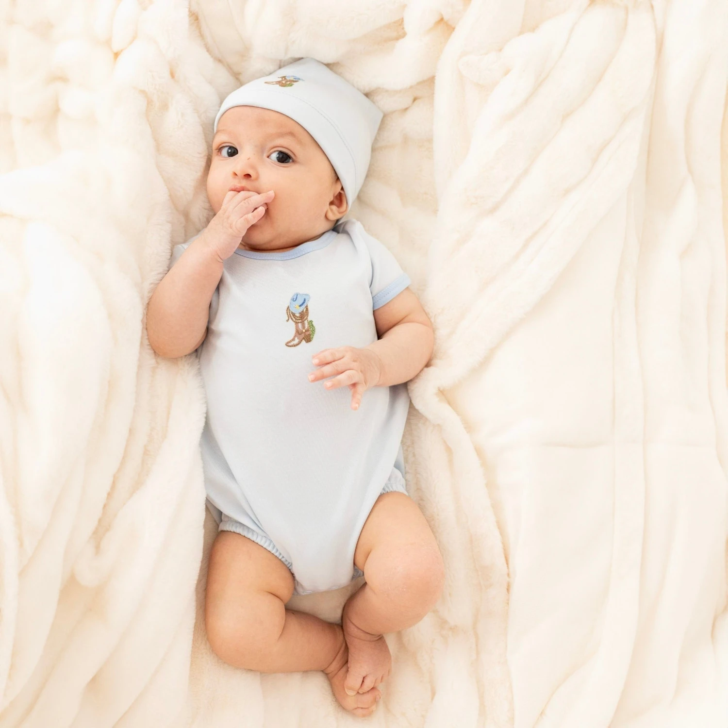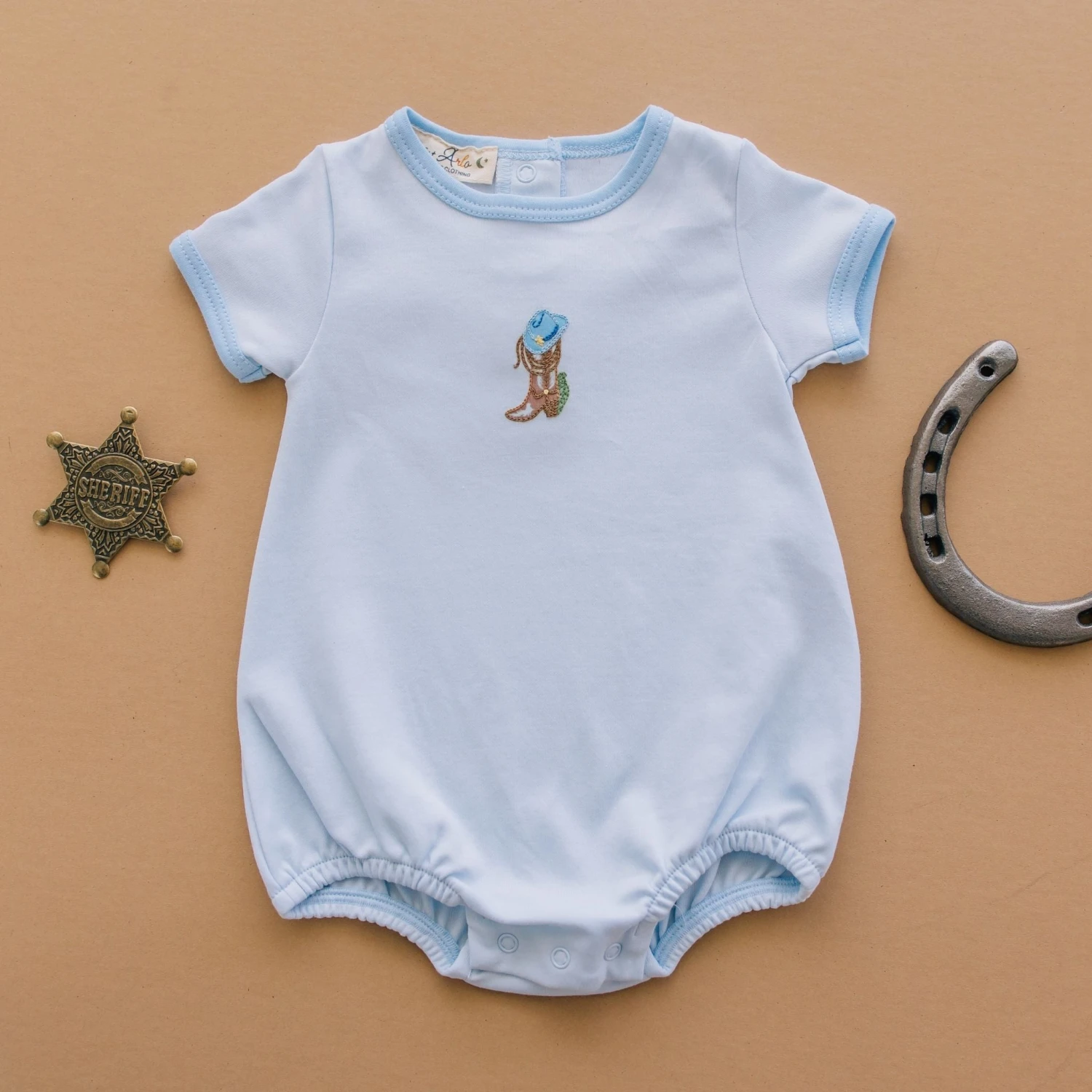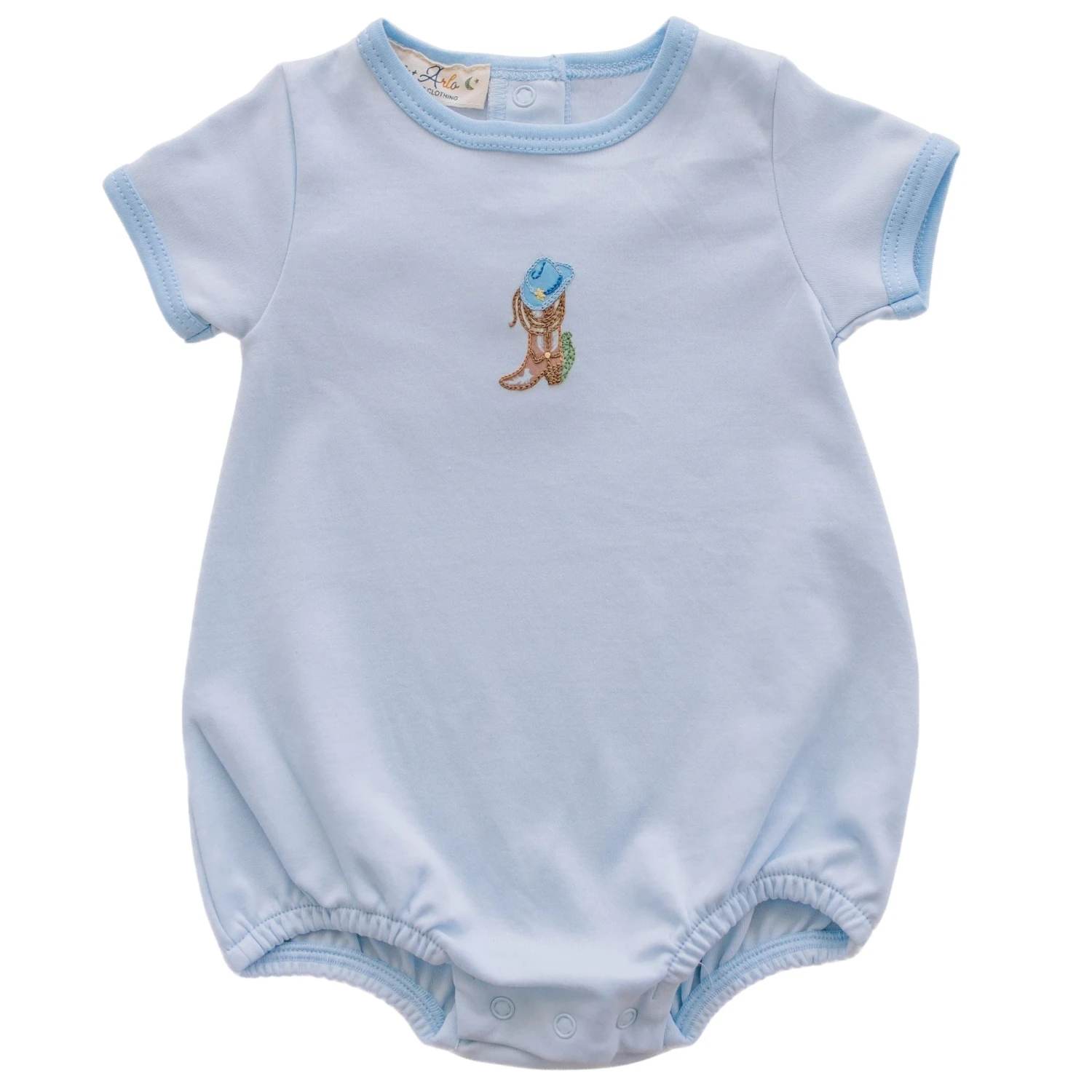 Adorn your little one in the gentle comfort and whimsical charm of the “Boots and Blooms” collection with this sweet luxurious Pima Cotton bubble from Luna & Arlo. The sweet light blue fabric showcases a lovely embroidered detail of a cowboy boot and hat on the chest. Practical snap closures ensure easy diaper changes, keeping your baby feeling fresh and comfortable. Hat sold separately.
