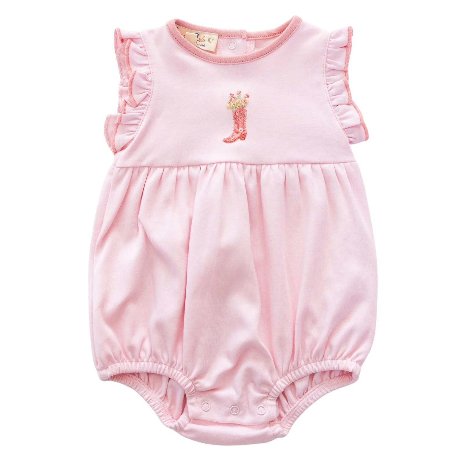 Wrap your little darling in the simple sweetness and playful charm of the “Boots and Blooms” collection with this cozy luxurious Pima Cotton bubble from Luna & Arlo. The beautiful pink fabric features a delightful embroidered cowboy boot blooming with spring and summer flowers on the chest, accented by sweet ruffles on the short flutter sleeves and around the leg openings.