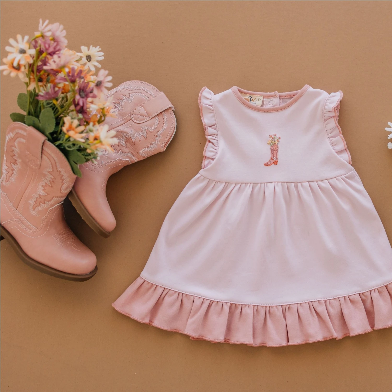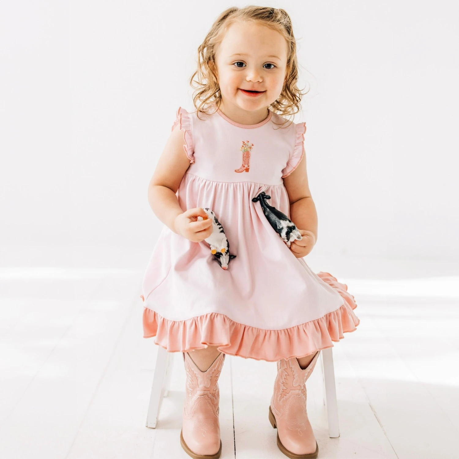 Adorn your little one in the gentle comfort and whimsical charm of the “Boots and Blooms” collection with this sweet luxurious Pima Cotton dress from Luna & Arlo. The sweet pink fabric showcases a lovely embroidered detail of a cowboy boot blossoming with spring and summer flowers on the chest, complemented by sweet ruffles on the flutter sleeves and around the hem.