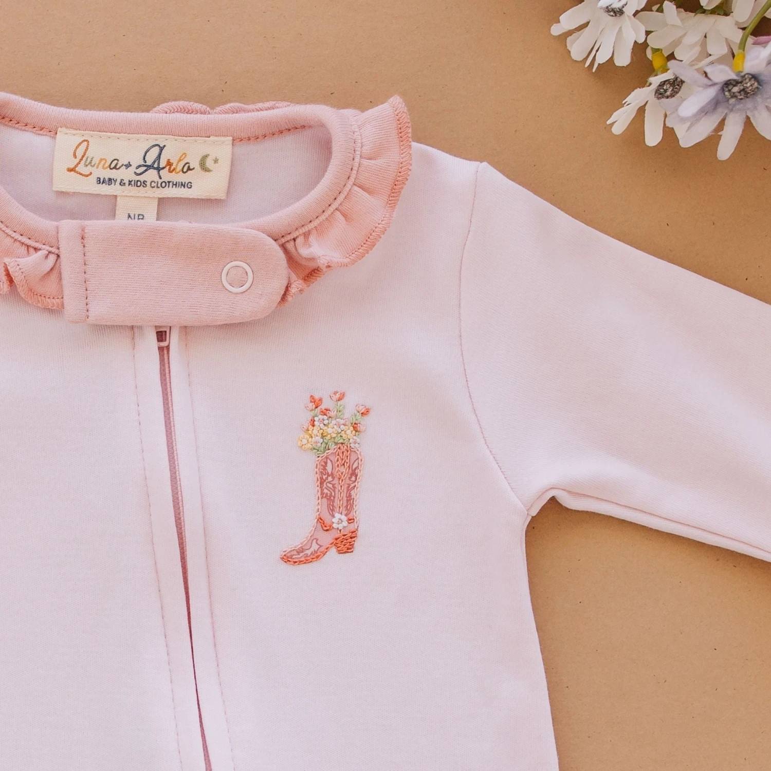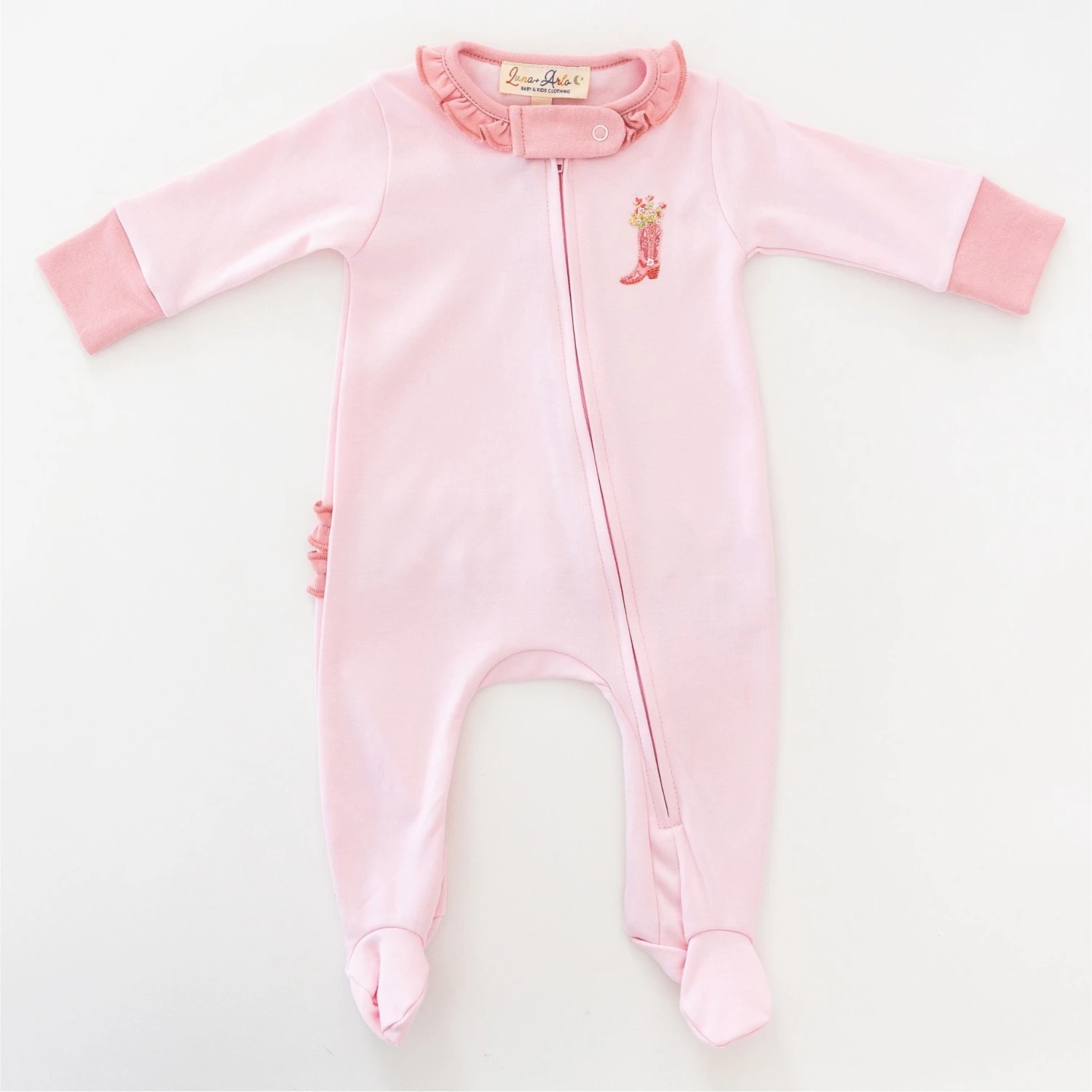 Luna & Arlo Boots and Blooms Ruffle Zip Footie – Pink