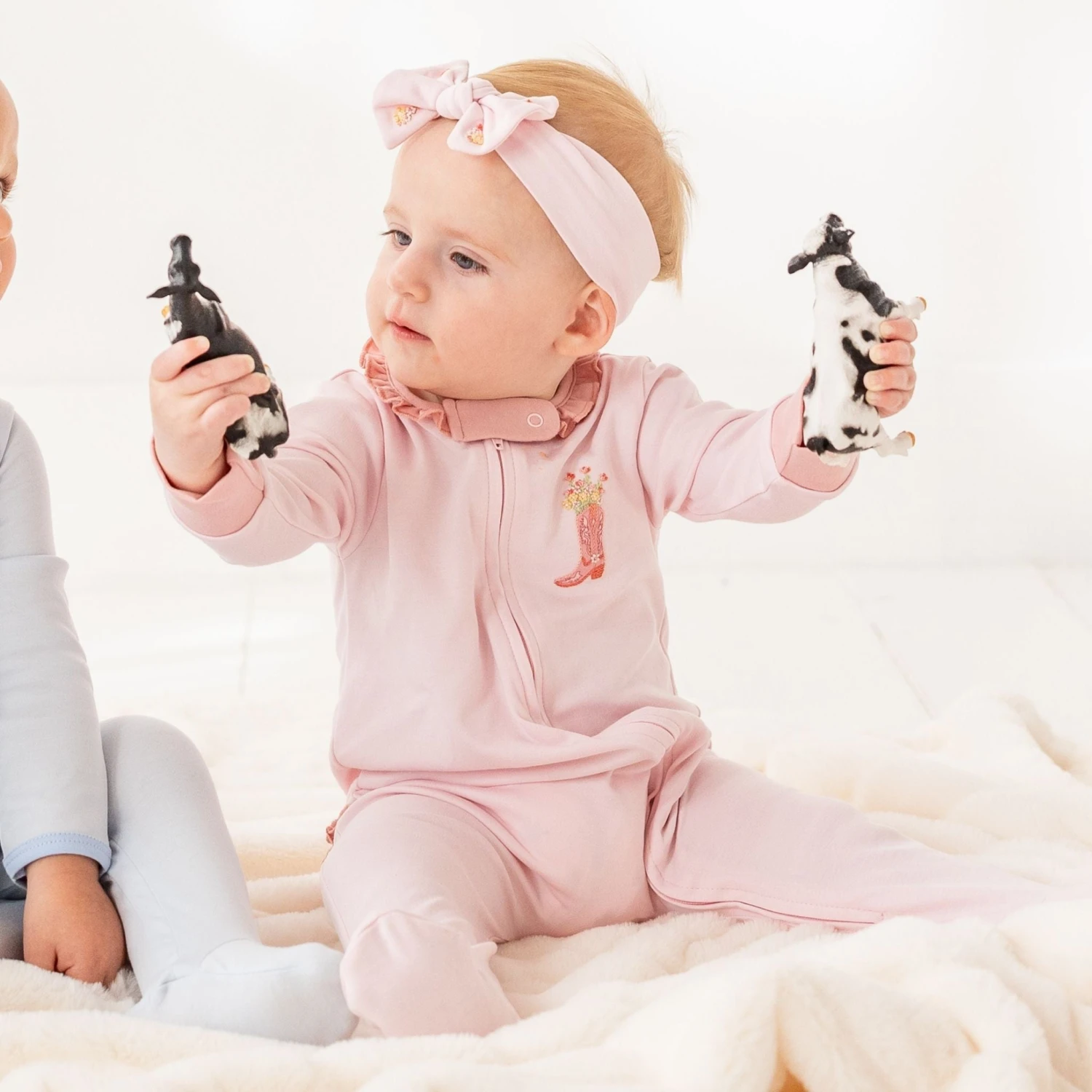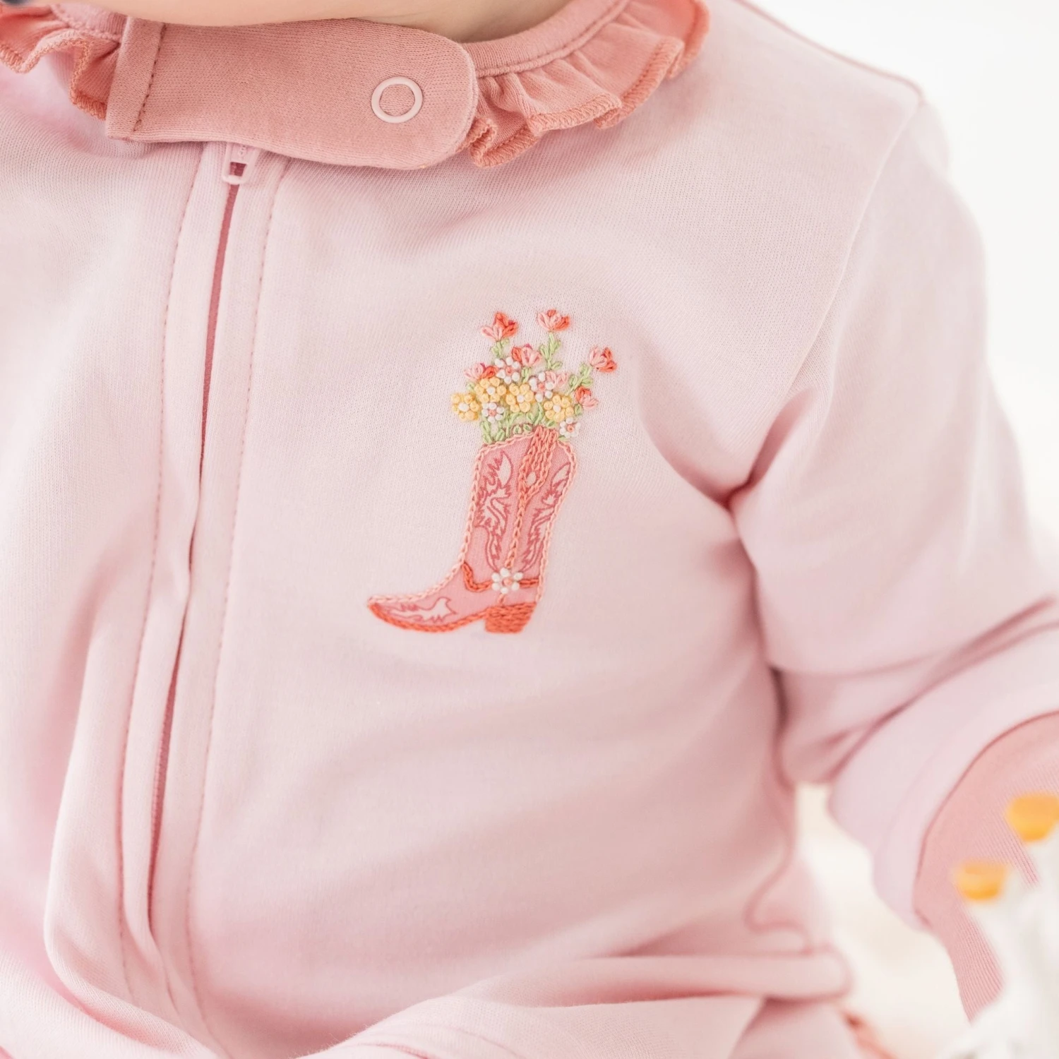 Wrap your little one in the charming comfort of the “Boots and Blooms” collection with this soft luxurious Pima Cotton footie from Luna & Arlo. Featuring a sweet embroidered cowboy boot adorned with spring and summer florals on the chest, and delightful ruffles along the neckline, this pink footie perfectly blends playful style with cozy comfort.