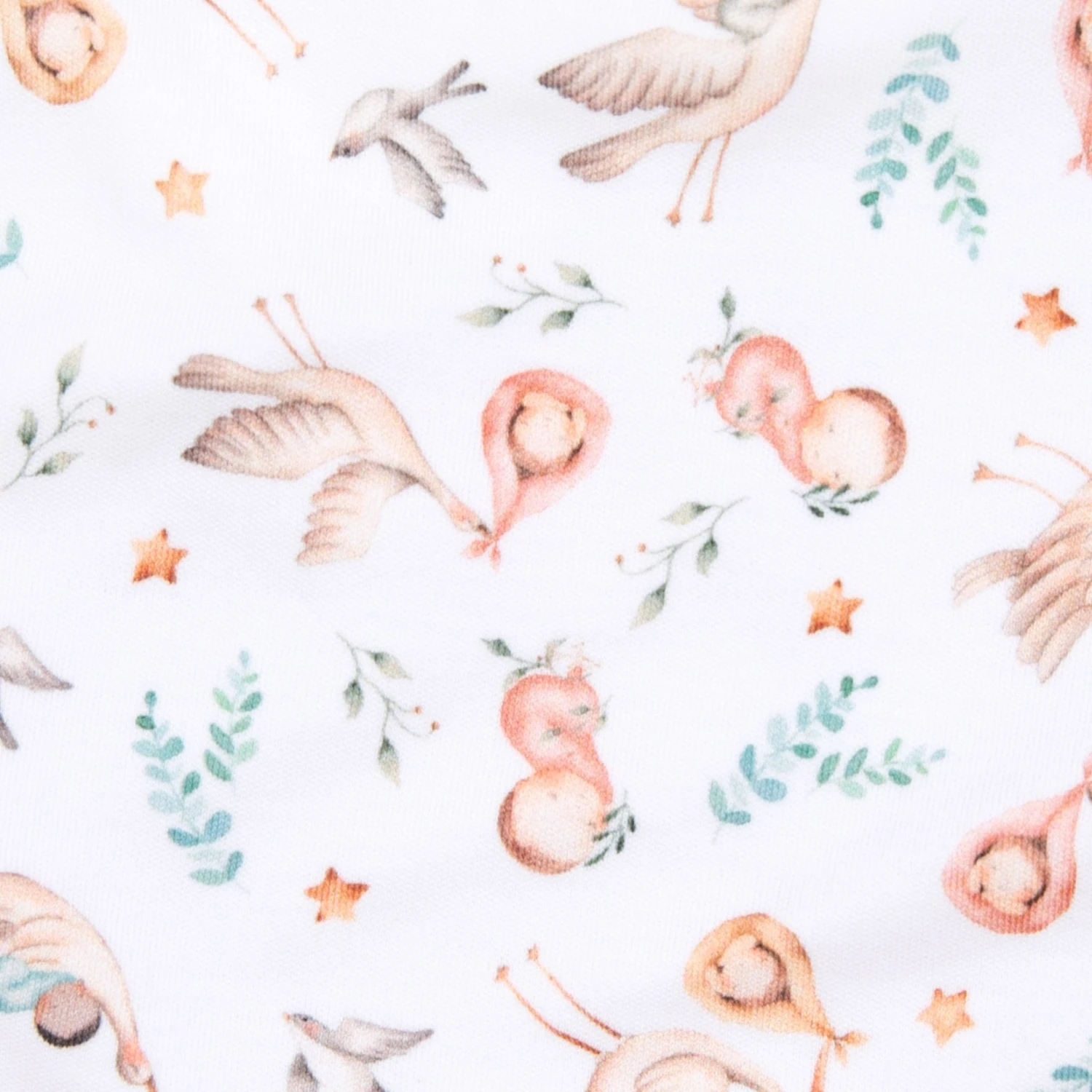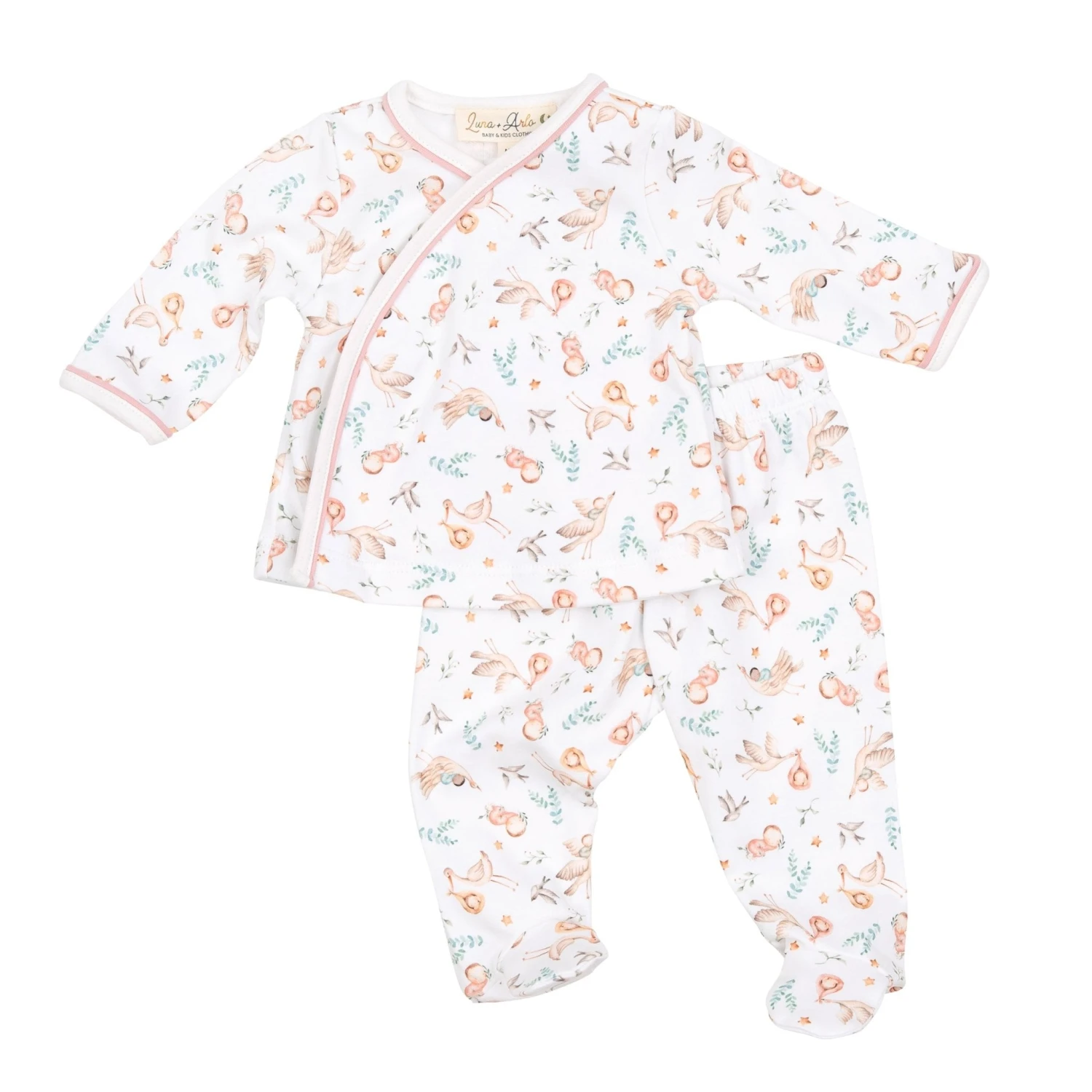 Welcome your little one with the Luna & Arlo “Cherished Arrivals” footed pant set, a delightful set crafted from the softest ivory pima cotton printed with a whimsical watercolor print of storks and sweet babies, this set is designed to embrace your newborn in pure comfort and luxury.