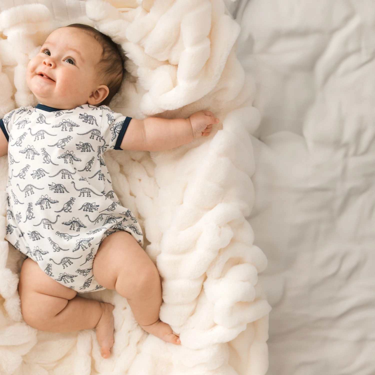 Bring a touch of paleontology to playtime with our Dino Digs Bubble Romper—made in Peru from 100% ultra-soft ivory Pima cotton and printed edge-to-edge with navy dinosaur skeletons. Each little T-Rex, Triceratops, and Stegosaurus “bones” silhouette is artfully scattered across the fabric, creating a playful yet sophisticated motif that’s perfect for photographs, everyday adventures, and heirloom keepsakes alike.