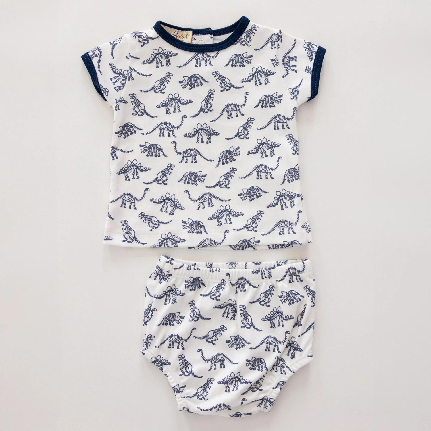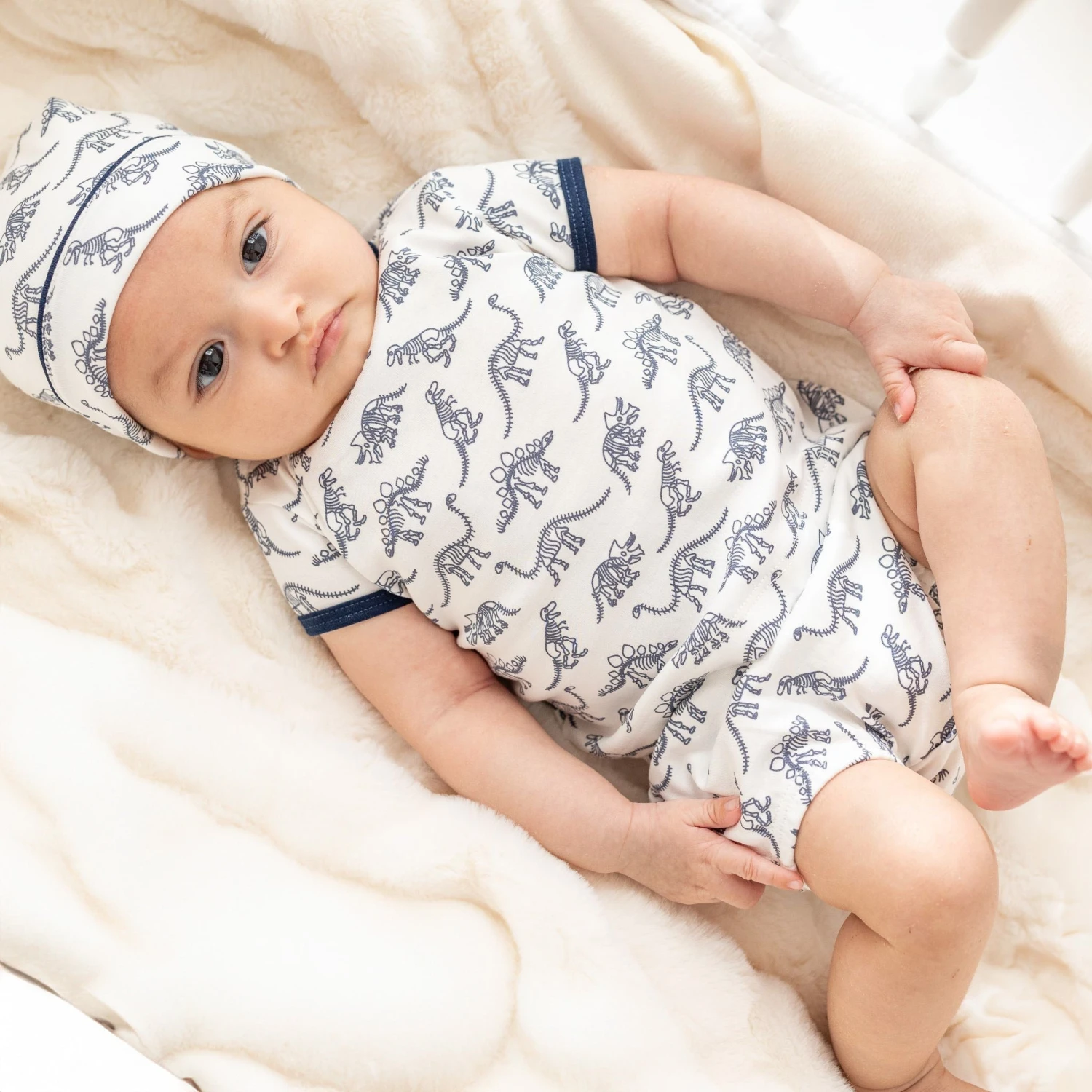 Bring the Jurassic era to your little one’s wardrobe with our Dino Digs Diaper Set—made in Peru from 100% ultra-soft ivory Pima cotton and printed edge-to-edge with navy dinosaur skeletons. This two-piece ensemble pairs a short-sleeve tee with a coordinating diaper cover, creating a cohesive, photo-ready look that’s as practical as it is playful. *Hat is not included