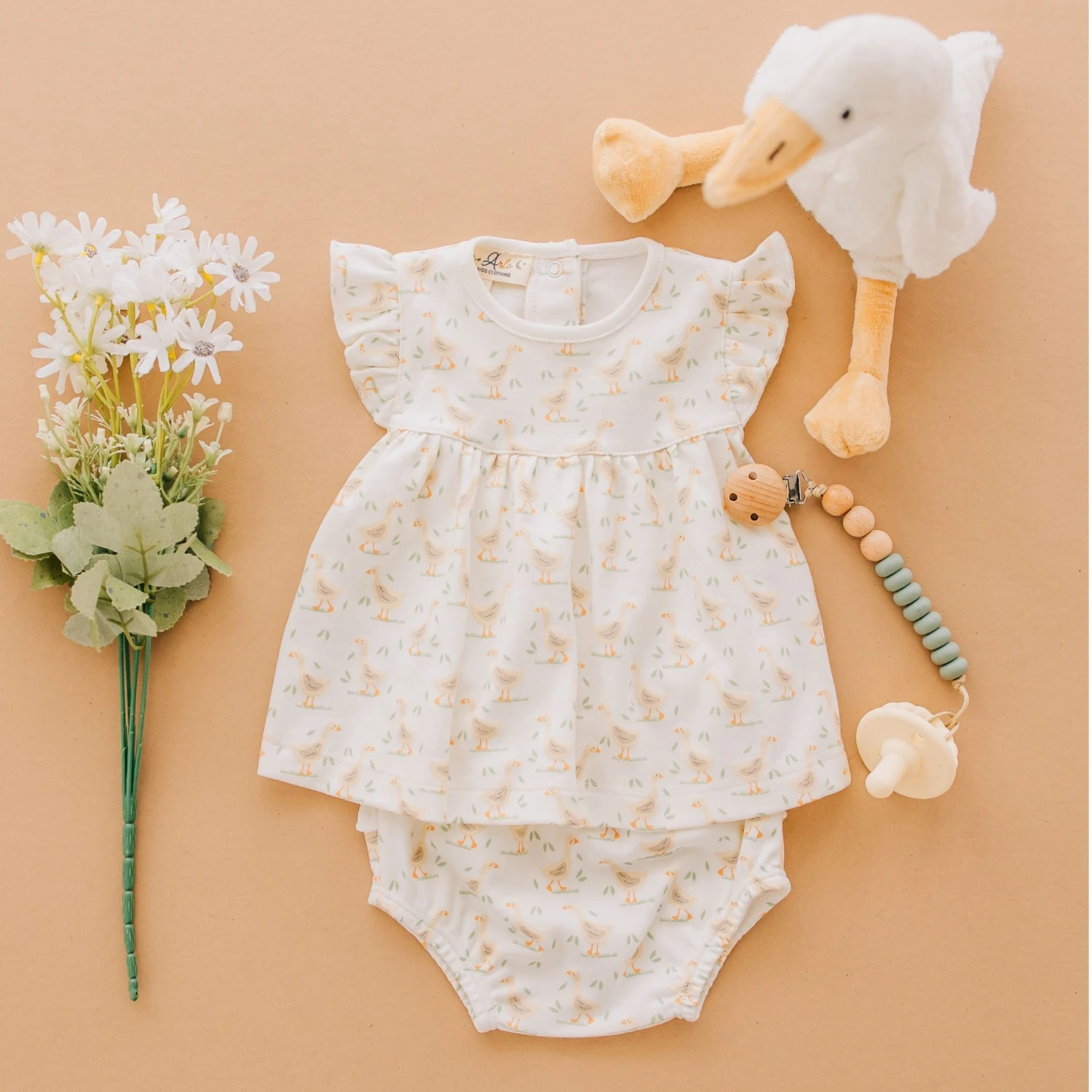 Dress your little one in gentle charm with this adorable two-piece set, featuring a sweet print of geese. Crafted from the most luxurious Pima Cotton, this set adds a touch of heartwarming sweetness to everyday wear.