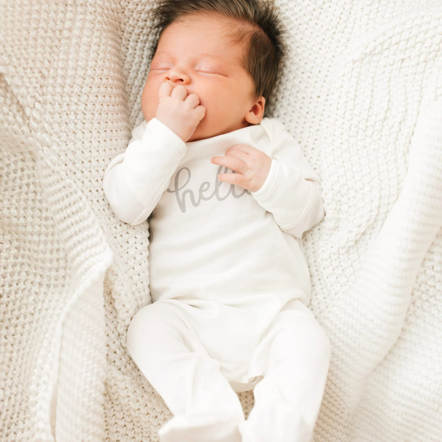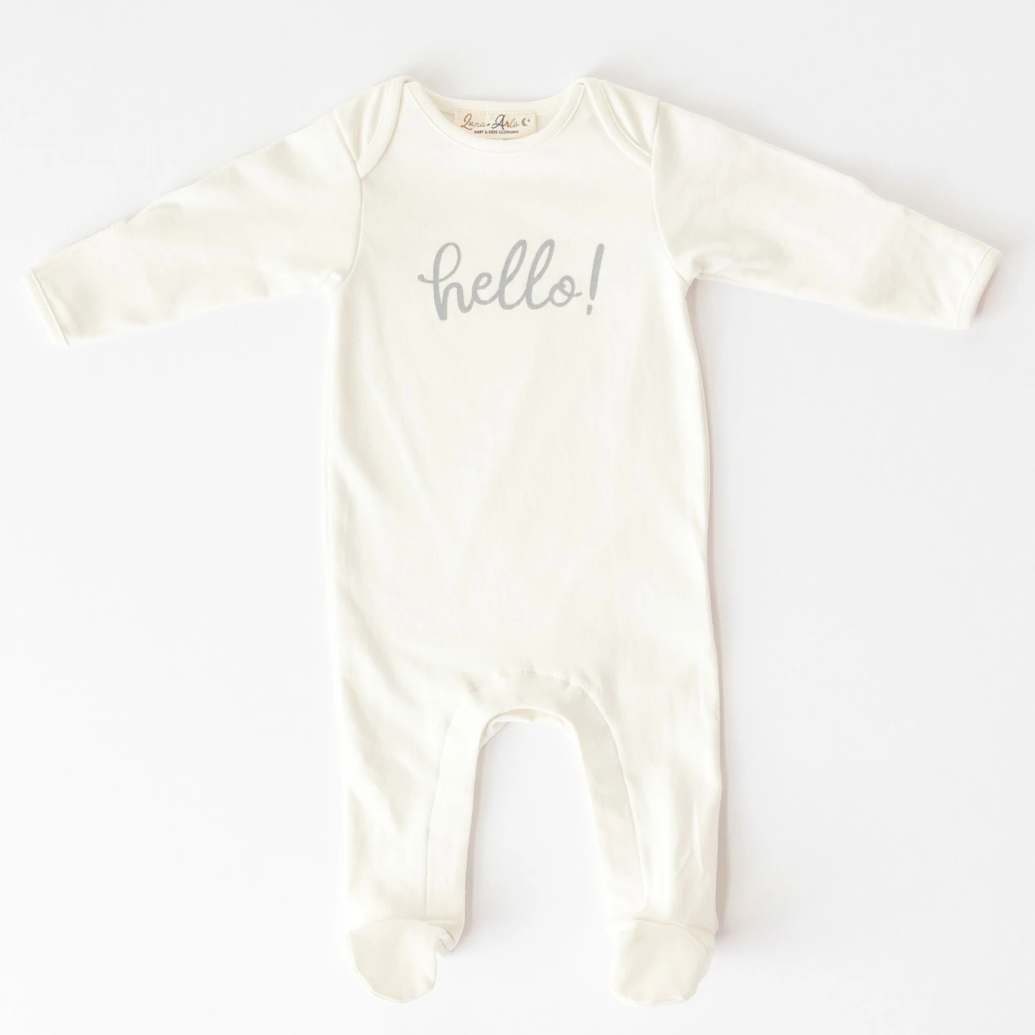 Soft, breathable, and endlessly cozy—the Luna & Arlo Ivory Pima Cotton “Hello!” Lap Footie is a must-have for newborns and infants.