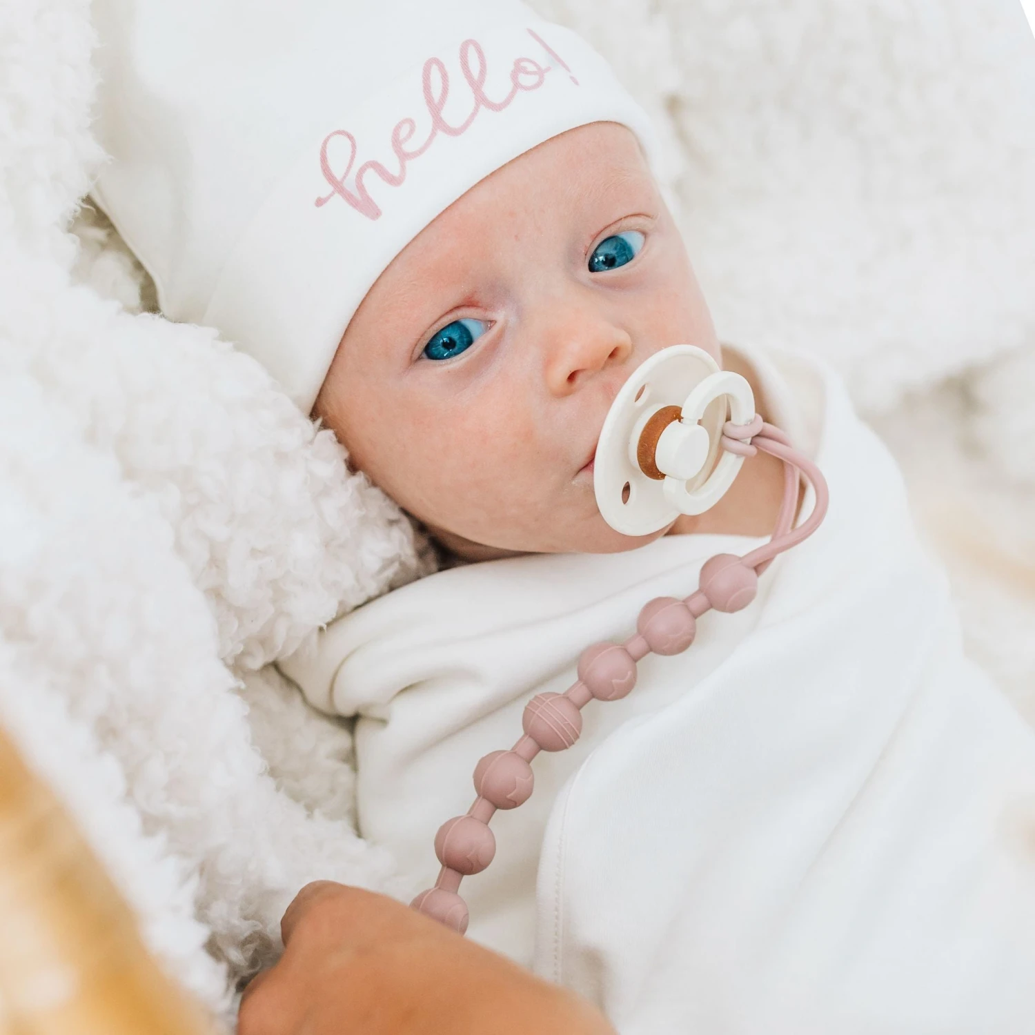 - Color: Ivory with Dusty Rose “hello!” print