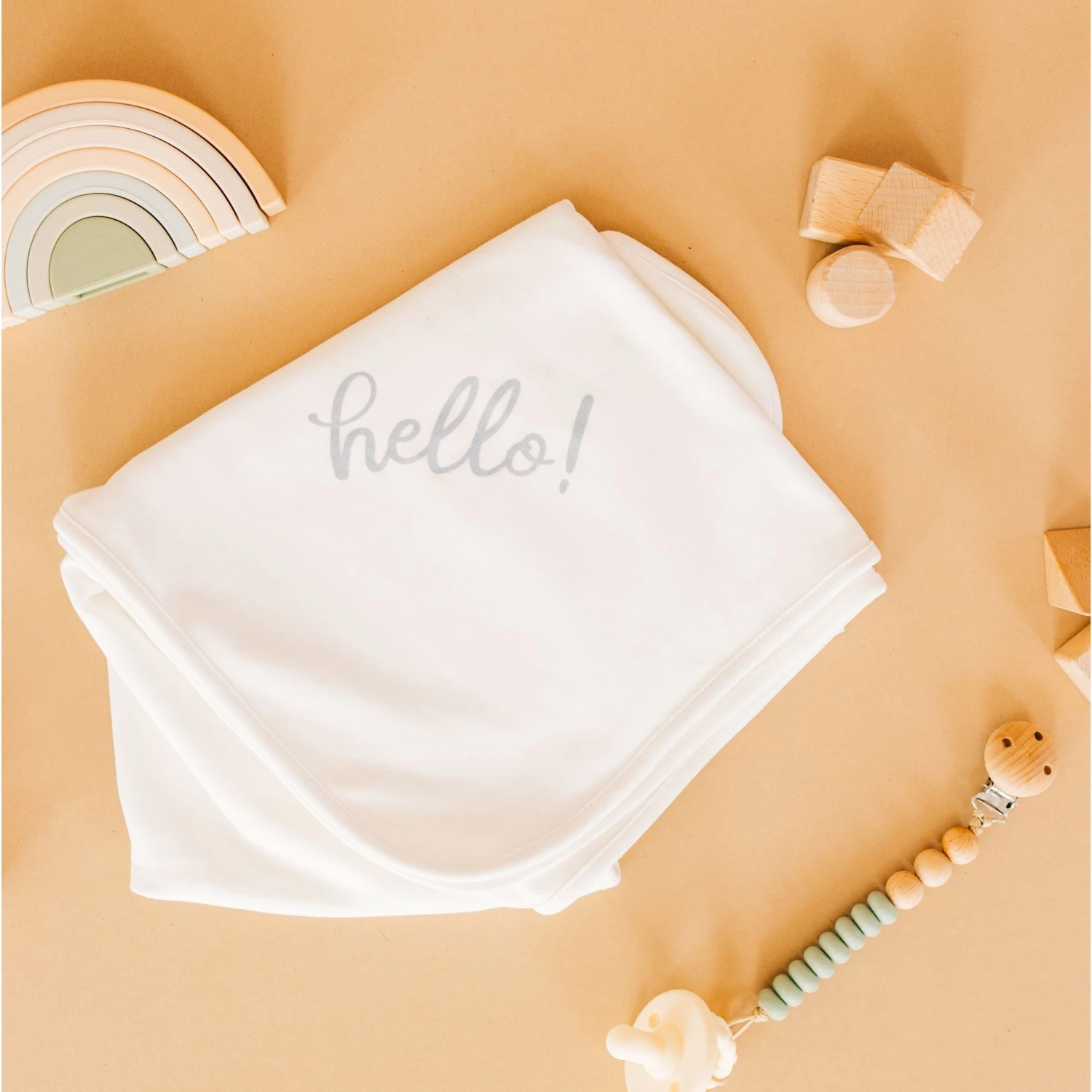 Silver “Hello!” Script: Modern calligraphy accent in one corner for a minimalist, gender-neutral look