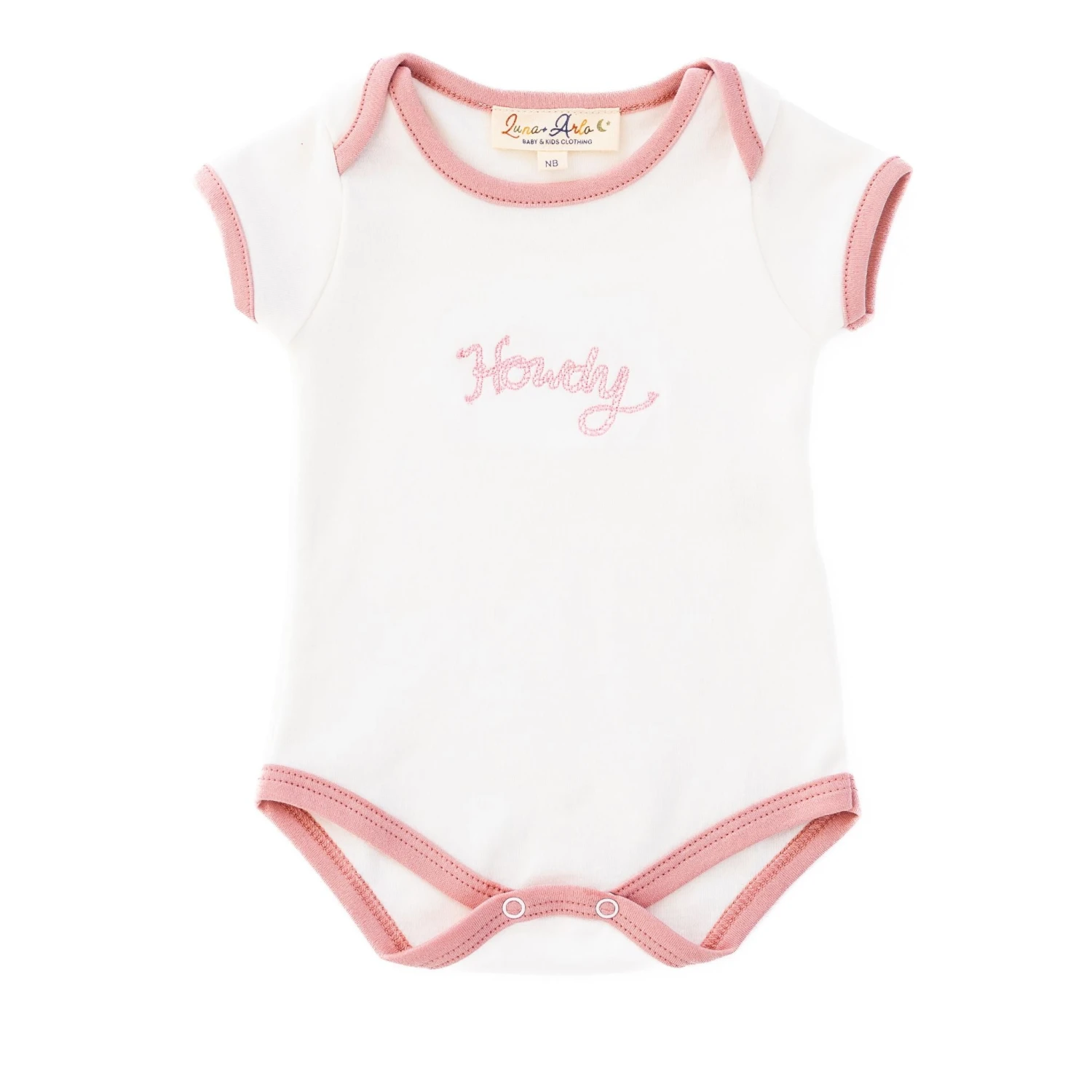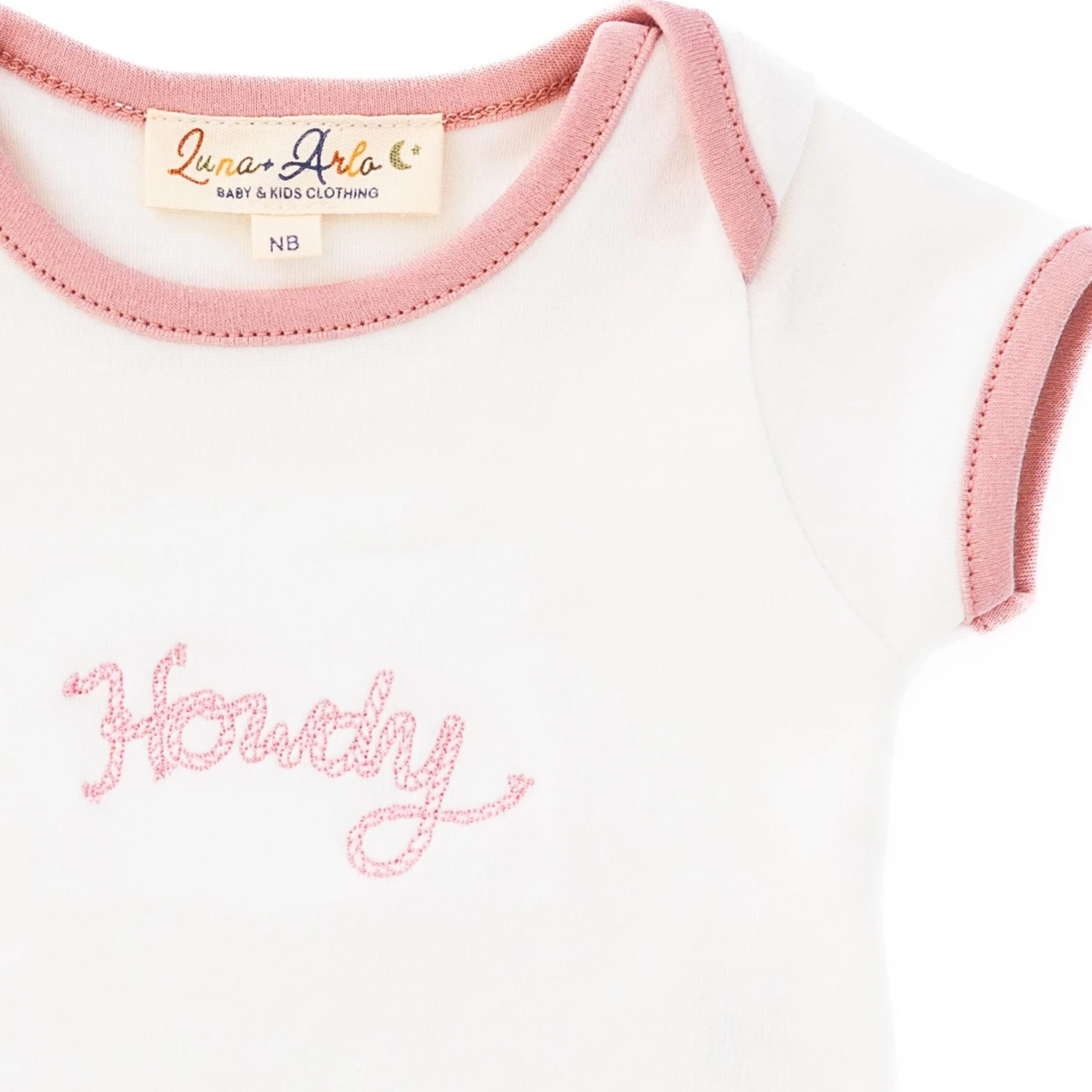 Howdy, darlin’! This sweet Luna & Arlo “Howdy” embroidered bodysuit is perfect for your little cowgirl. Made from our signature ivory Pima cotton, it’s incredibly soft and breathable against delicate skin. The “Howdy” embroidery and contrasting trim in a beautiful dusty rose add a touch of western charm.