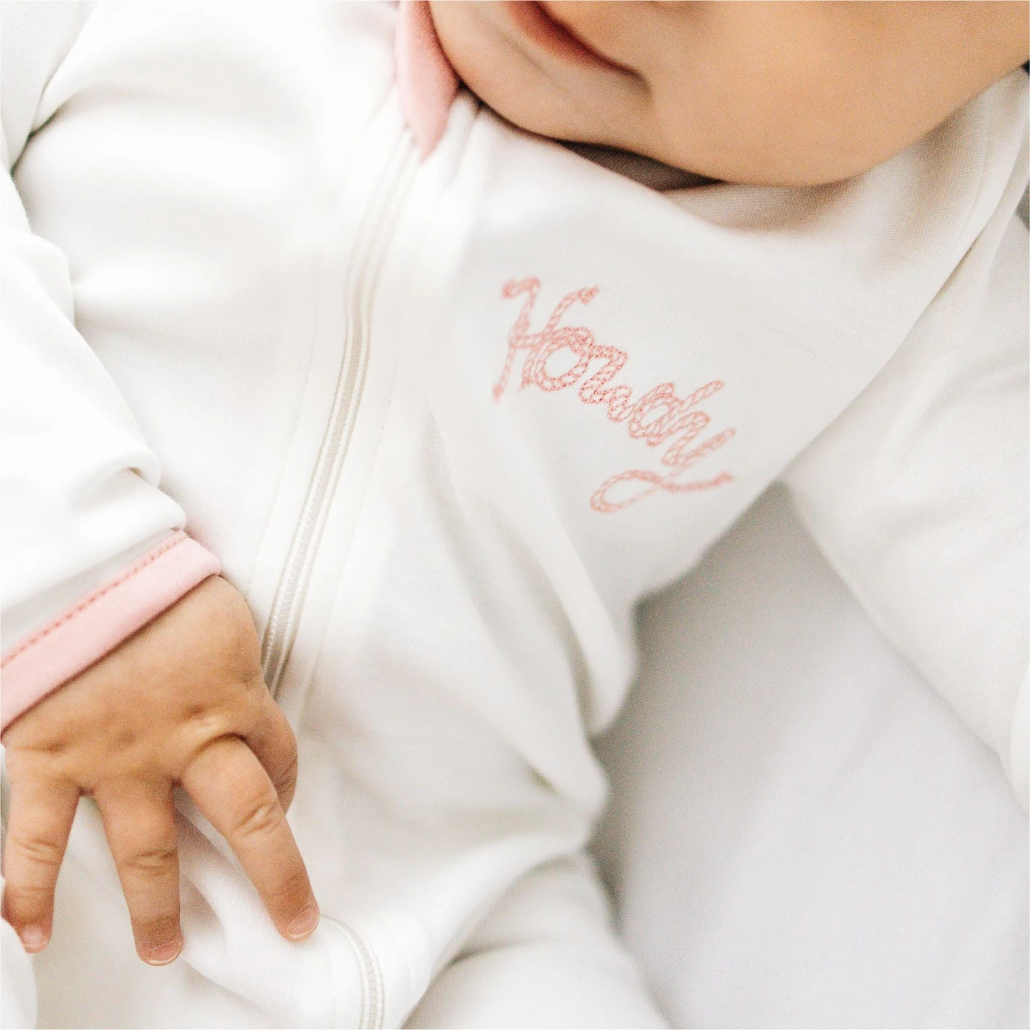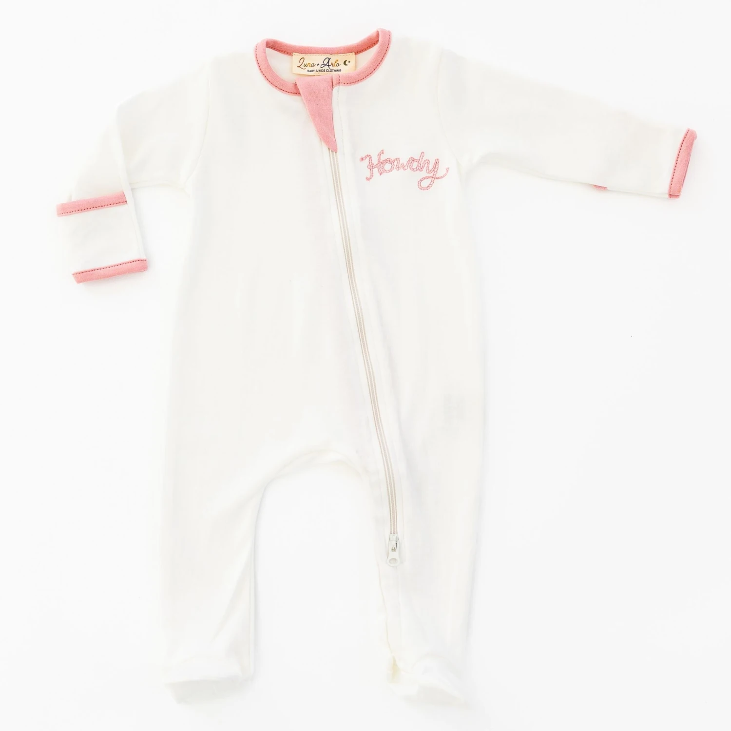 This adorable Howdy! Zip Footie by Luna and Arlo is made with luxurious ivory Pima cotton and features a dusty rose trim and howdy embroidery, perfect for your little cowgirl. Keep her cozy and stylish with this must-have onesie.