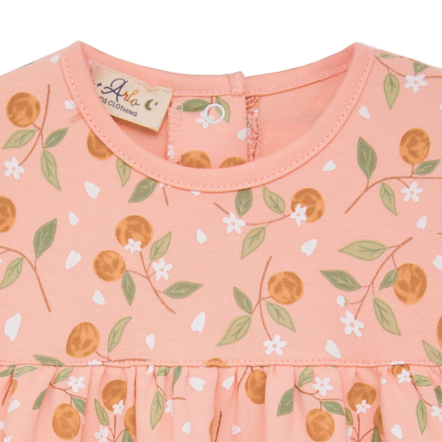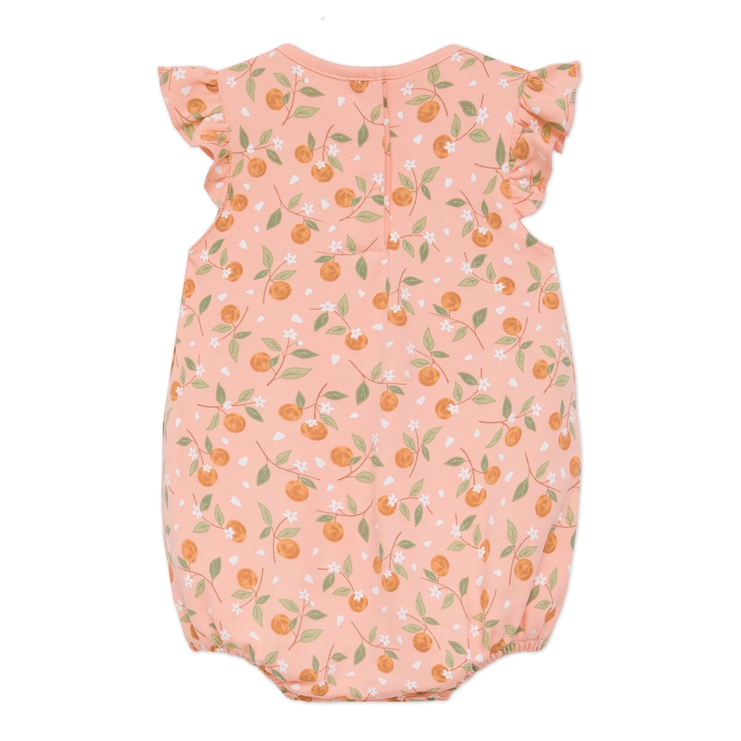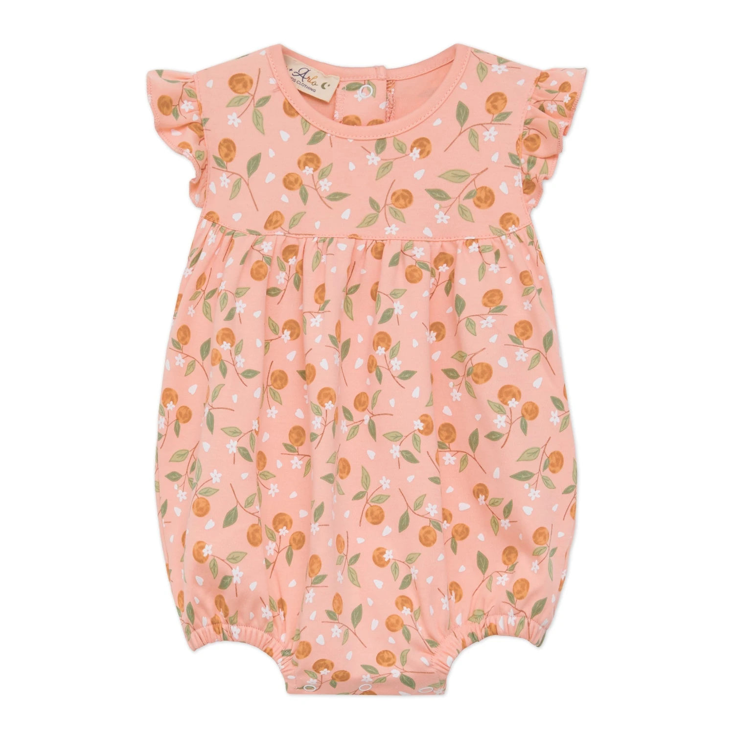 Wrap your little darling in the simple sweetness of luxurious Pima Cotton with this adorable bubble from Luna and Arlo’s “”Orange Blossoms”” collection. The charming print showcases a delightful mix of vibrant oranges and delicate white blossoms with green leaves scattered across a soft pink background. Sweet flutter sleeves add a touch of classic Luna and Arlo charm to this warm-weather outfit.