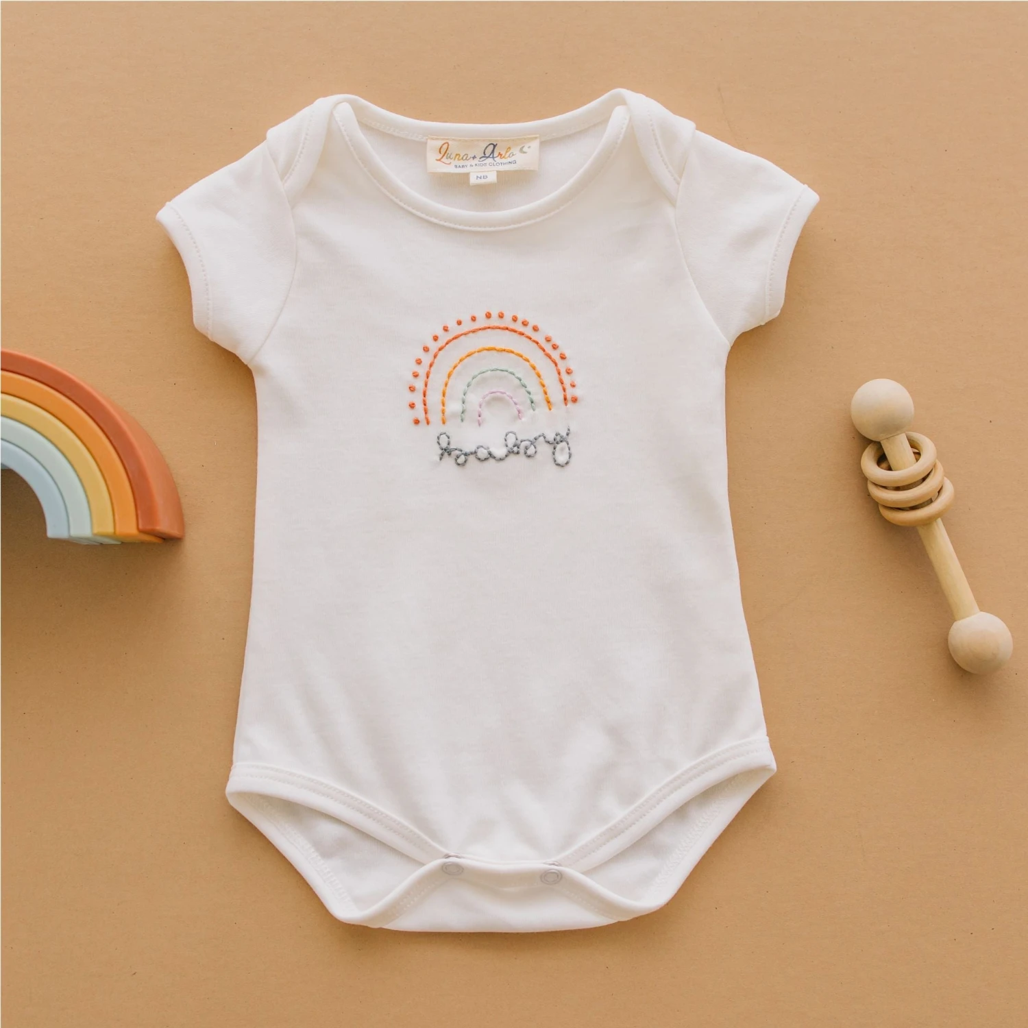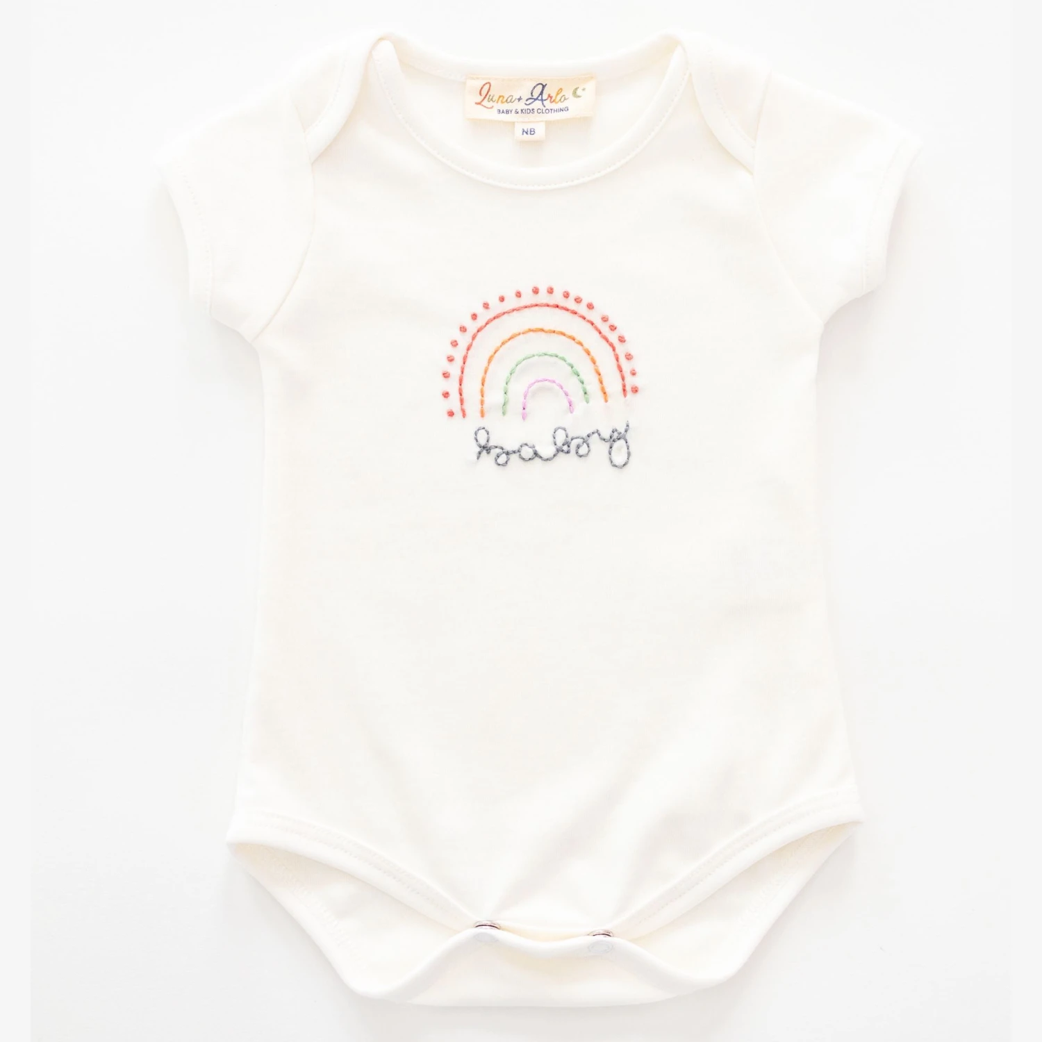 Celebrate the miracle of a rainbow baby in this ultra-soft ivory bodysuit, lovingly hand-embroidered in Peru with a pastel rainbow and “baby” script. Crafted from premium Peruvian Pima cotton, it’s breathable, durable, and gentle on delicate skin—perfect for everyday wear and layering under sleepers or jackets.