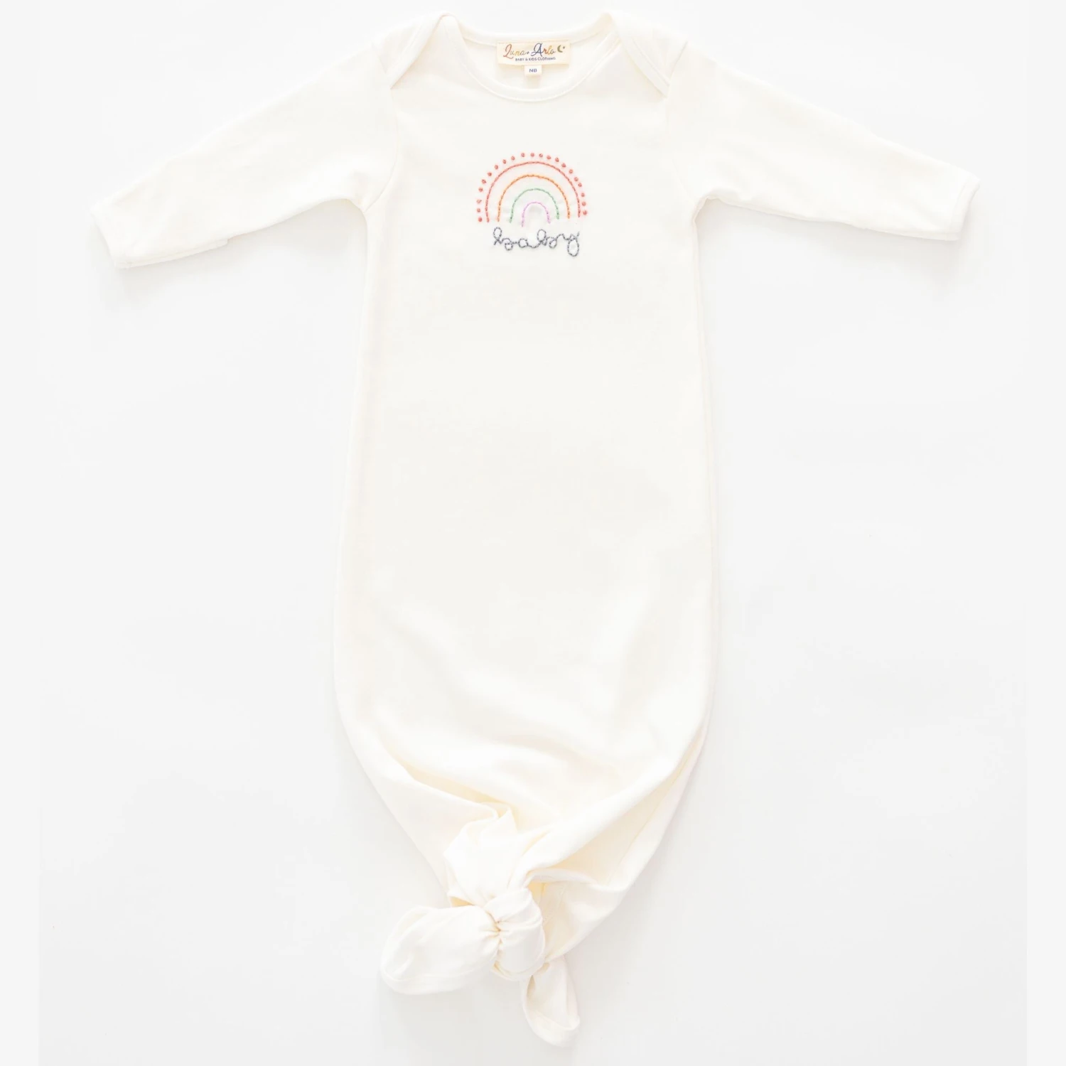 Snuggle up your rainbow baby in this ivory knot gown, hand-embroidered in Peru with our signature rainbow. The adjustable knot hem grows with baby for extra swaddle warmth and easy diaper access.