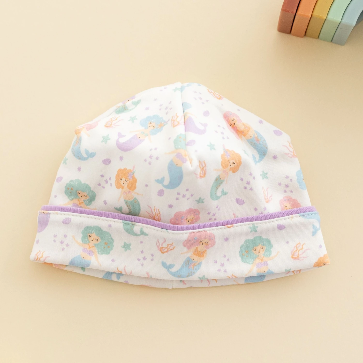 Keep your little one cozy in this soft hat, featuring a delightful print of mermaids and sea life. Crafted from the most luxurious Pima Cotton, this headwear evokes a sense of underwater wonder and comfort.
