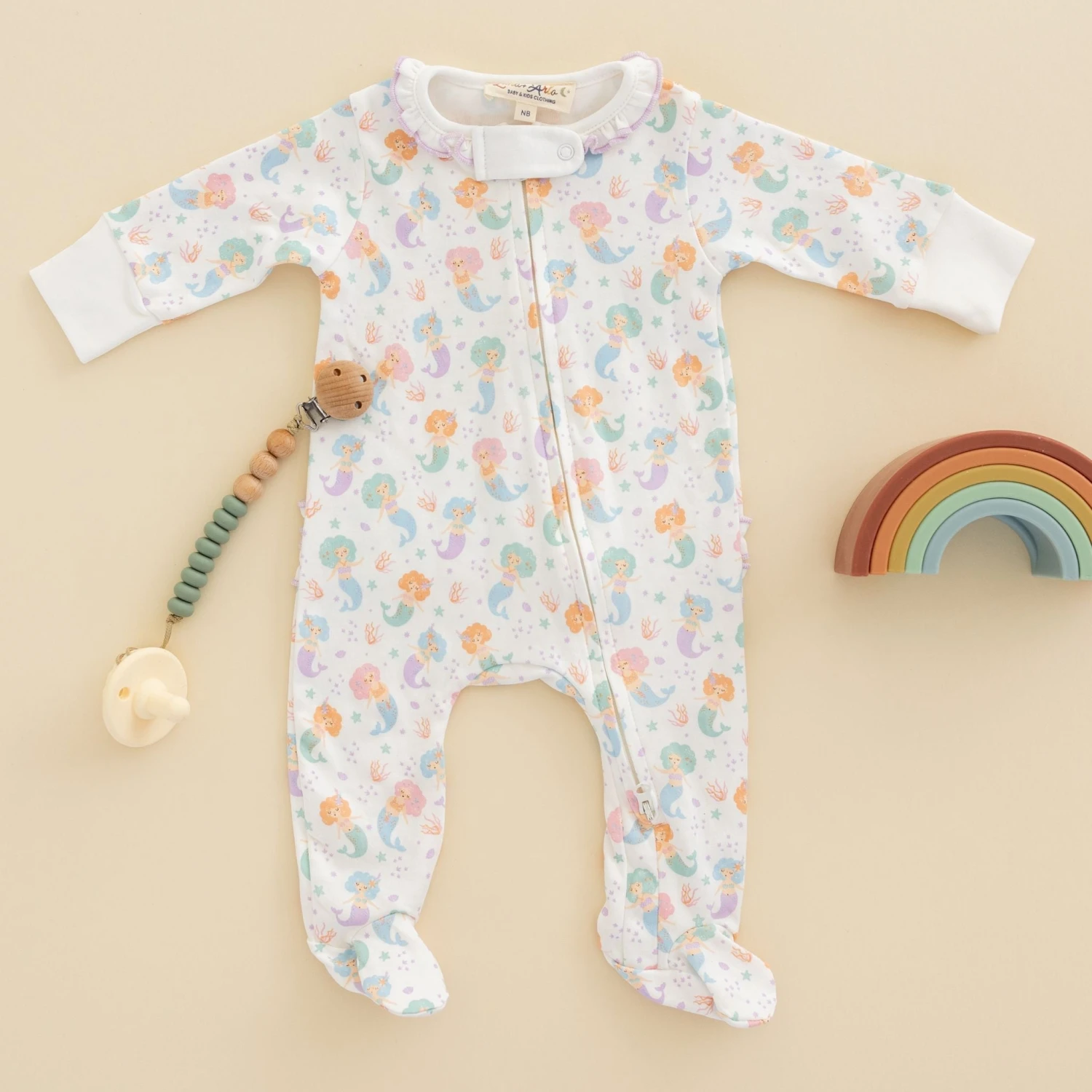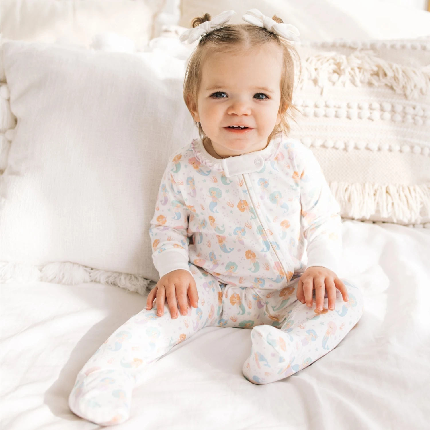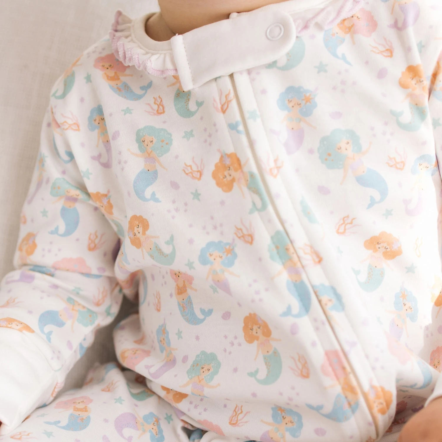 Wrap your little one in underwater magic with this footie, featuring a delightful print of mermaids and sea life. Crafted from the most luxurious Pima Cotton, and inspired by ocean dreams and cozy snuggles, this piece brings a touch of wonder to bedtime.
