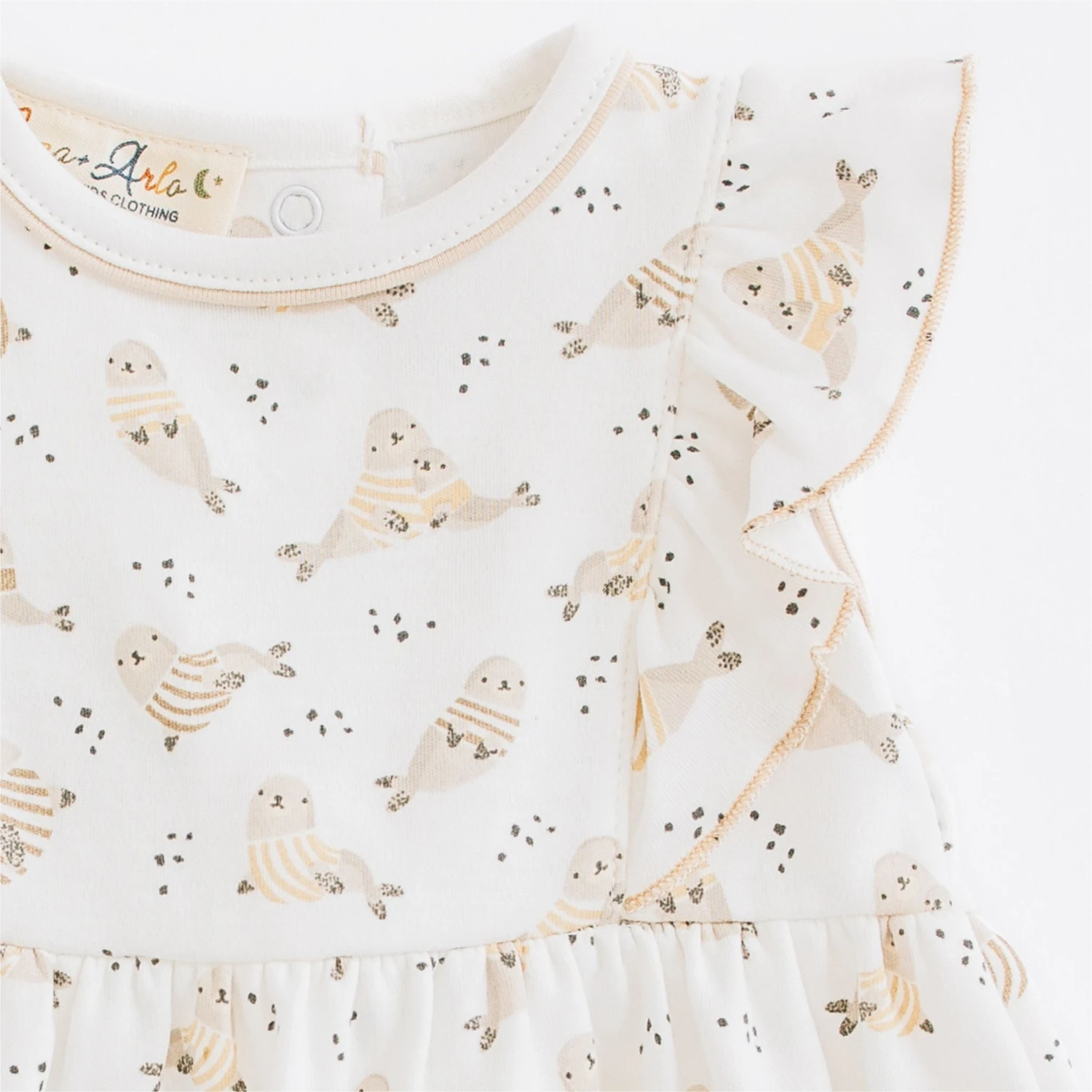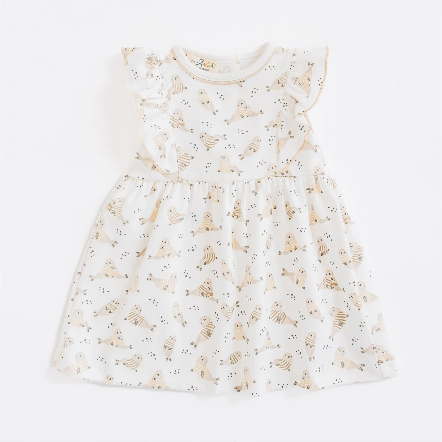 Twirl into summer fun with this enchanting dress. Made from soft luxurious Pima Cotton, this dress features the charming walrus and baby walrus print, making it a sweet and comfortable choice for any occasion. Its gentle silhouette and lightweight fabric are ideal for warm days, whether at a picnic or enjoying a walk.