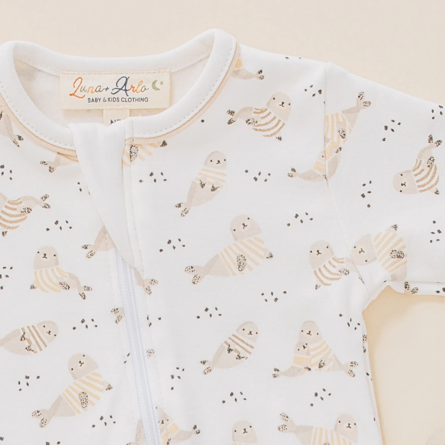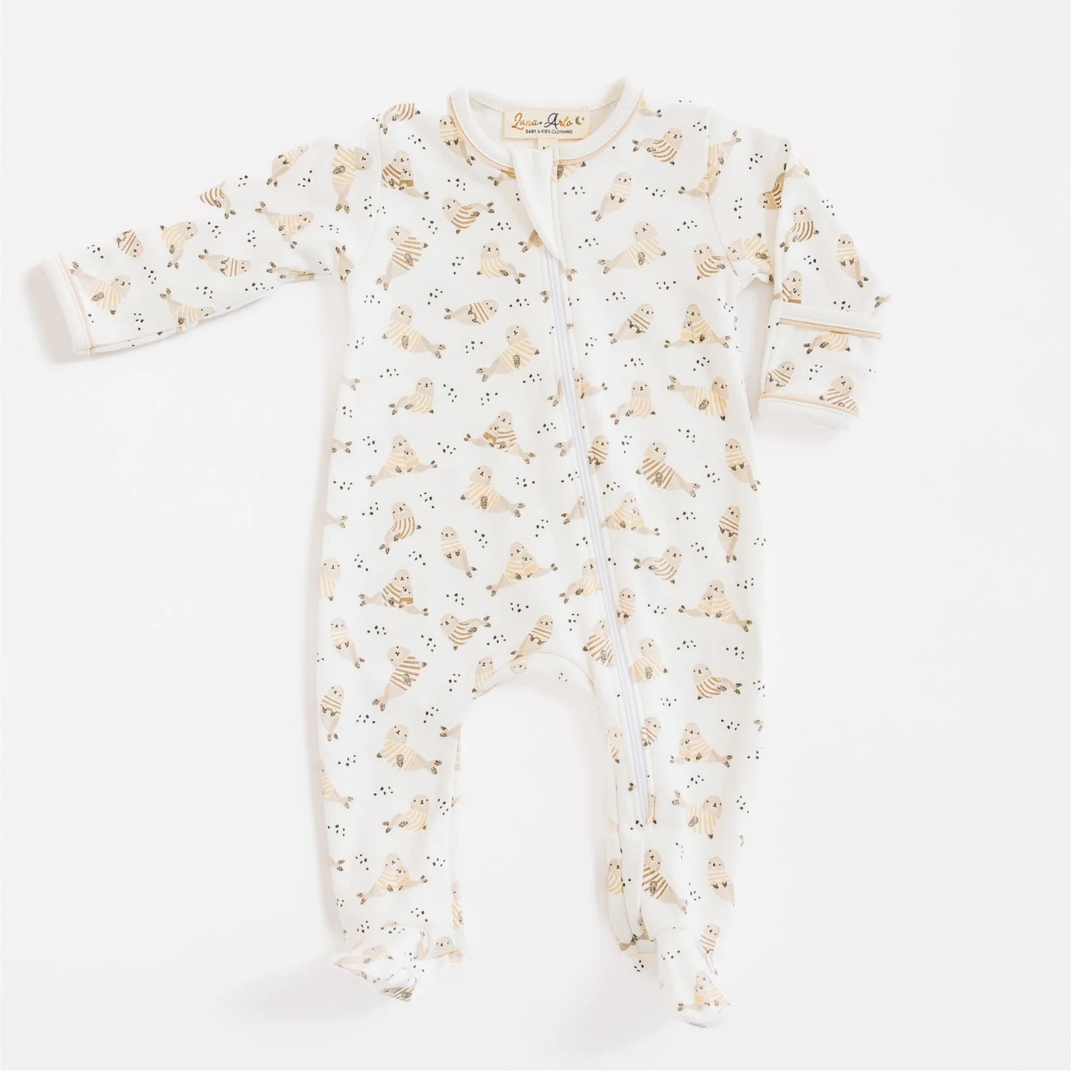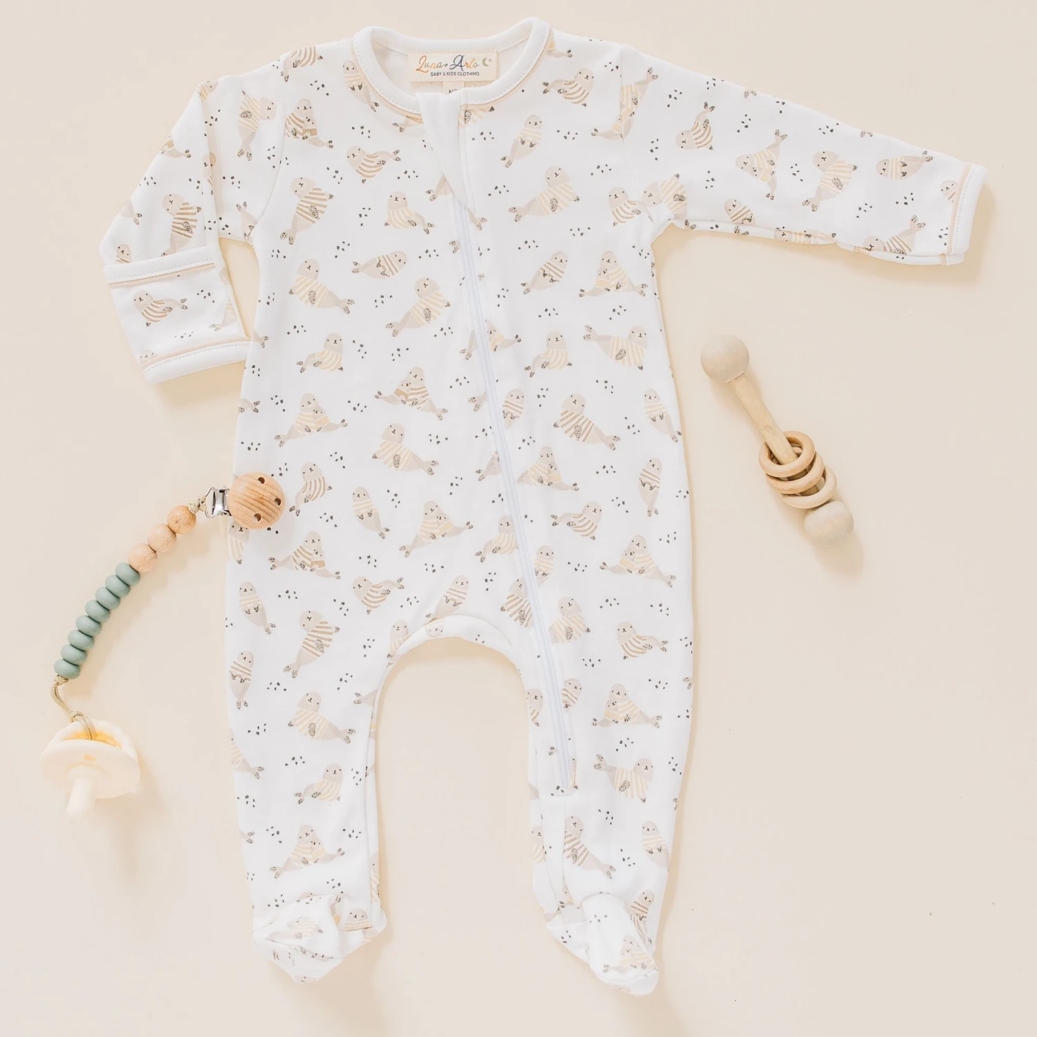 Keep your little one cozy from head to toe in this adorable Zip Footie. Made from luxuriously soft Pima Cotton, this full-body garment features the charming ‘Walrus Cuddles’ print, ensuring comfort for sleep or play. Additionally, thoughtful fold-over cuffs protect delicate skin from scratches. This footie is perfect for snuggles at home or enjoying cooler evenings after a beach walk.